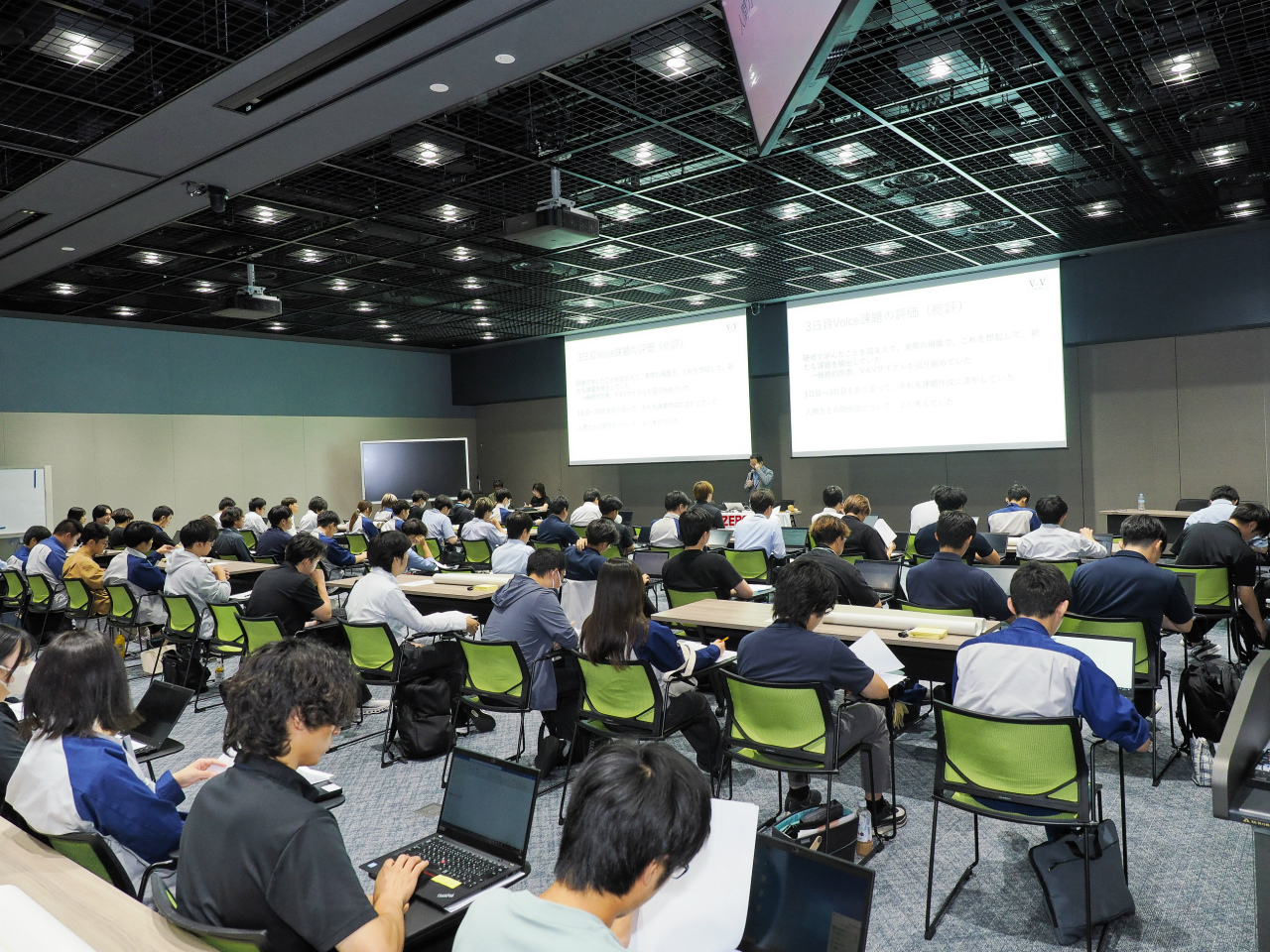 4日目の主な流れとしては、講師を務める株式会社スポーツドライビングジャパン(以下、SDJ)が前回提示した課題(Vision)に対する受講者からのアンサー(Voice)の中から、SDJの太田哲也校長が選出したテンベストの発表から始まりました。続いて、SDJより研修を総括した最後の課題が提示され、受講生は制限時間内にグループで話し合いレポートを作成し、その内容を壇上で発表するという流れで進みました。